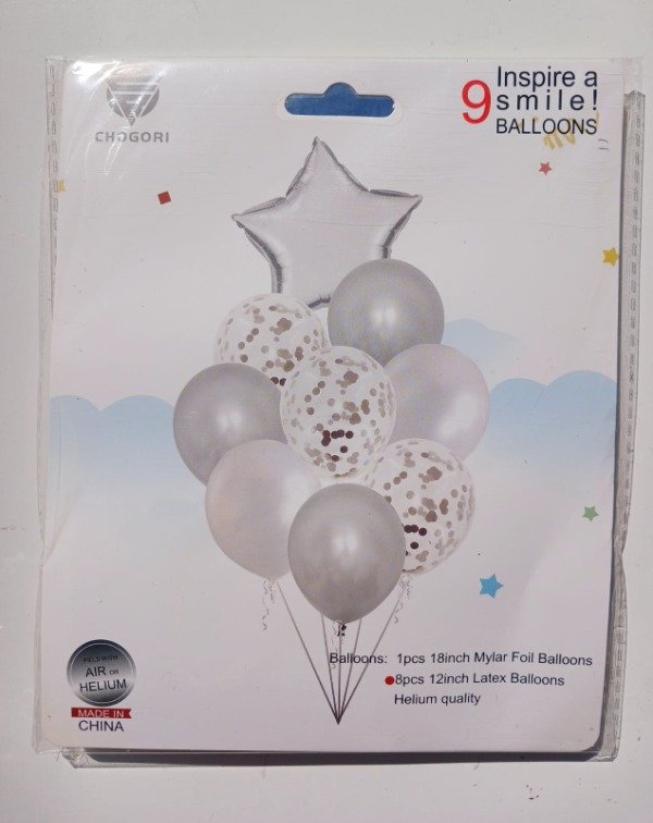Set Globos Mylar y Latex de 9 piezas Forma Estrella Plata